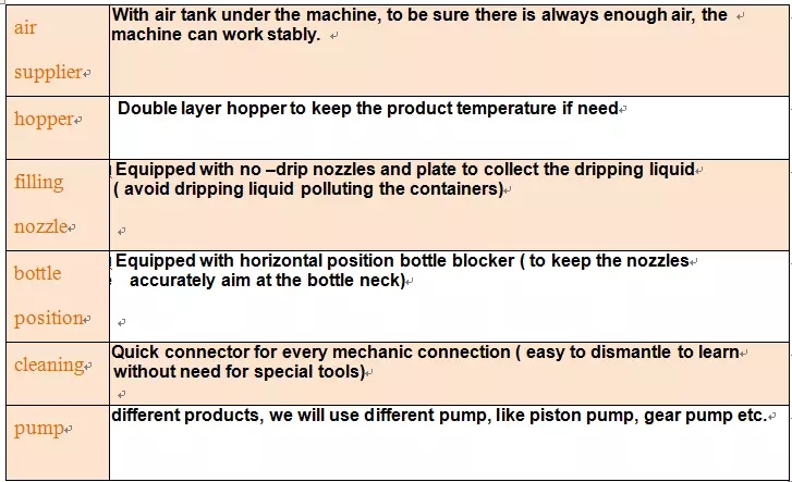 என்ஜின் எண்ணெய், மோட்டார் எண்ணெய், சாலட், கை சலவை ஜெல், தேங்காய் எண்ணெய், சோயாபீன் சாஸ், எள், ஷாம்பு, திரவ சோப்பு, எஞ்சின் எண்ணெய் போன்ற உணவுத் தொழில், ரசாயனத் தொழில் மற்றும் பொருட்கள் ஆகியவற்றில் உள்ள அனைத்து வகையான பாகுத்தன்மை / திரவங்களுக்காக இந்த இயந்திரம் சிறப்பாக தயாரிக்கப்படுகிறது. , பிரேக் ஆயில், சமையல் எண்ணெய், தக்காளி சாஸ், பானம், அத்தியாவசிய எண்ணெய், காய்கறி எண்ணெய், தேன், மிளகு சாஸ், வேர்க்கடலை வெண்ணெய், தயிர், சாறு, பானம் போன்றவை. திரவ / சாஸுடன் தொடர்பு கொள்ளப்பட்ட அனைத்து பகுதிகளும் உயர் தரமான எஃகு ஆகும். இயந்திரம் நிரப்புவதற்கு பிஸ்டன் பம்பை ஏற்றுக்கொள்கிறது. நிலை பம்பை சரிசெய்வதன் மூலம், அனைத்து பாட்டில்களையும் ஒரே நிரப்பு இயந்திரத்தில் நிரப்ப முடியும், விரைவான வேகம் மற்றும் அதிக துல்லியத்துடன்.